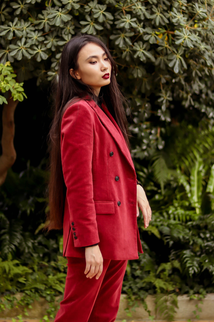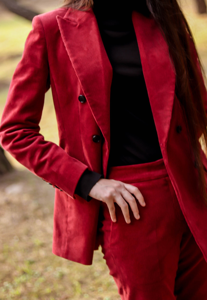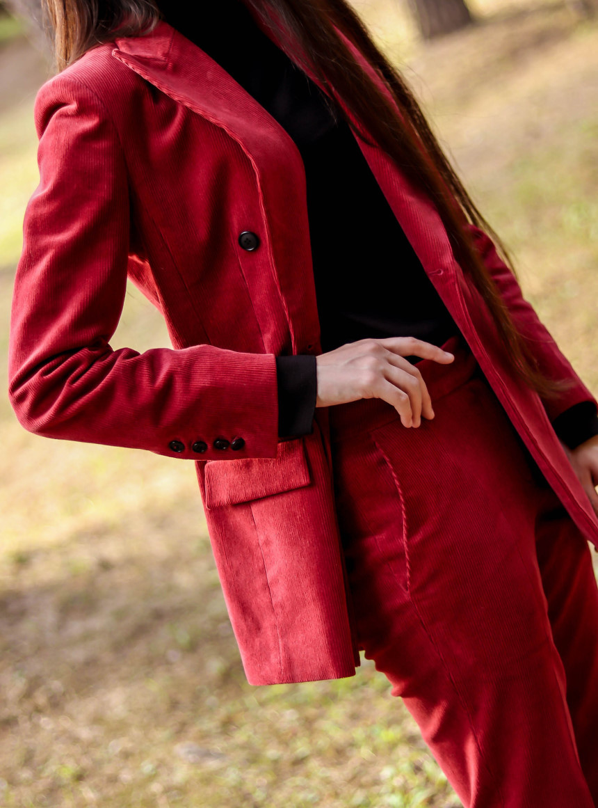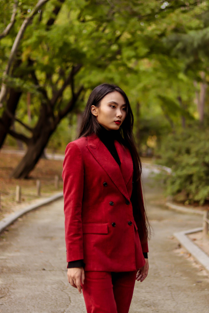 눈에 띄는 컬러여도 부담 없고 자연스러운 캐주얼의 매력이 더해진 코듀로이 수트로