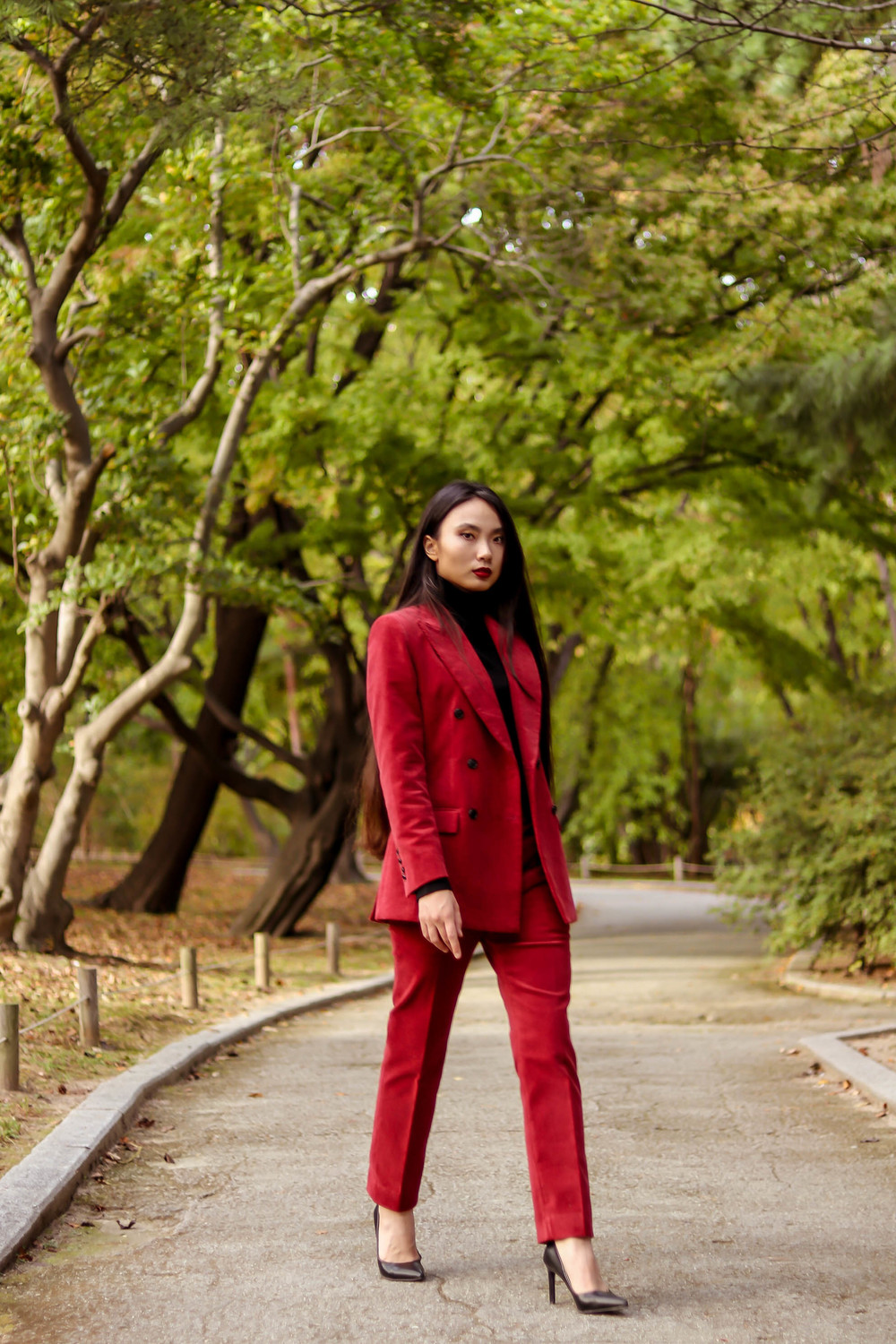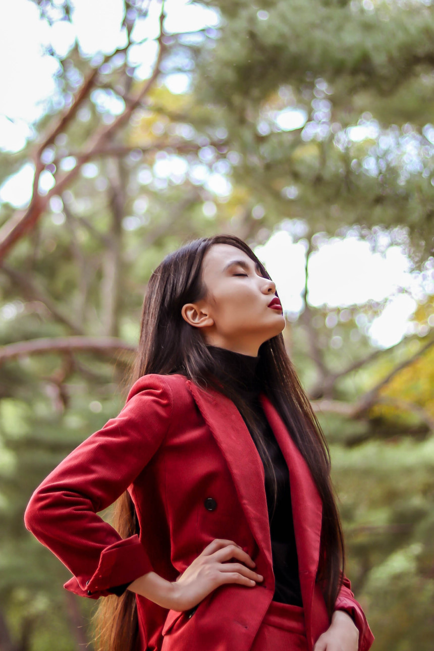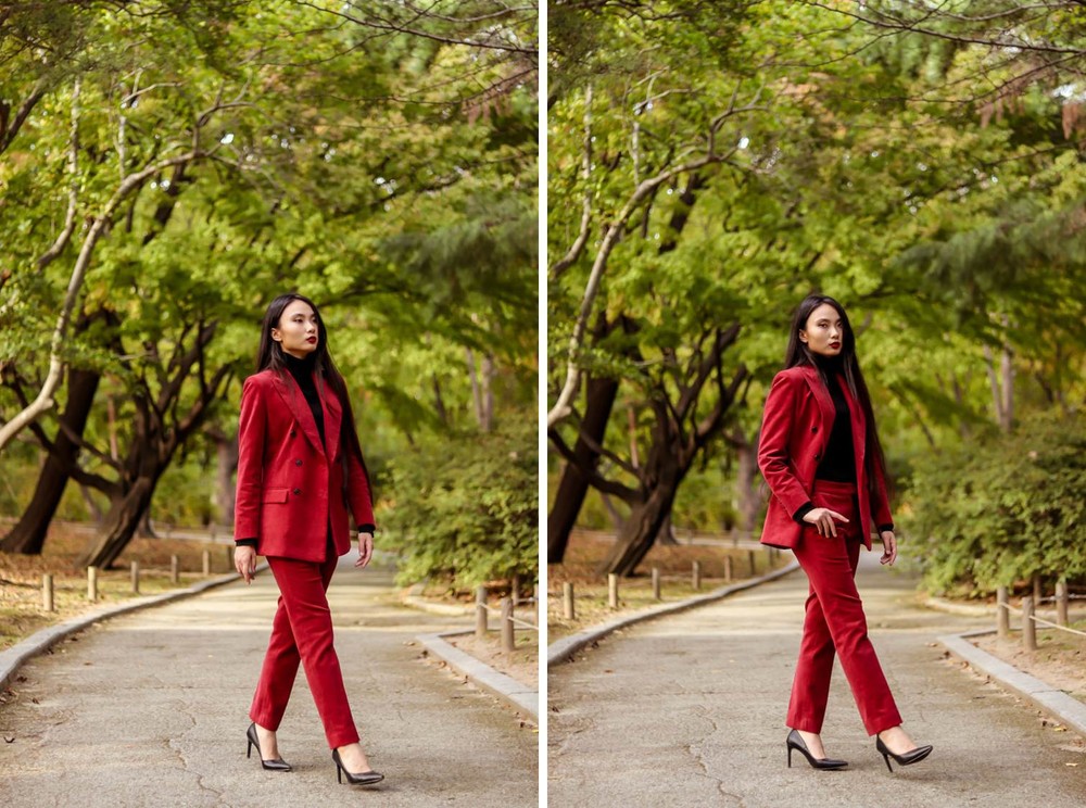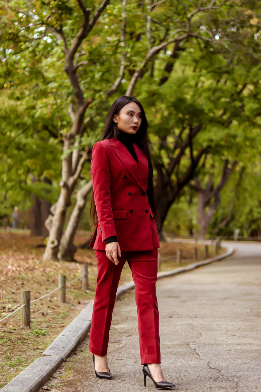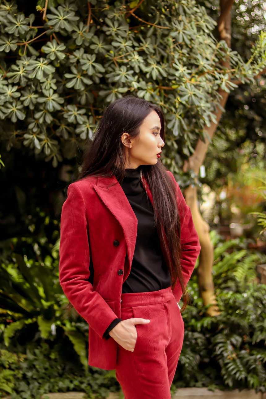 눈에 띄는 컬러여도 부담 없고 자연스러운 캐주얼의 매력이 더해진 코듀로이 수트로